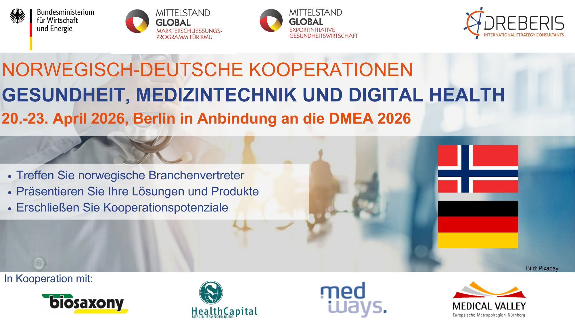 Vom 20.04. bis zum 23.04.2026 führt die DREBERIS GmbH im Auftrag des Bundesministeriums für Wirtschaft und Energie (BMWE), eine Informationsreise für norwegische Multiplikatoren und Entscheidungsträger aus der Gesundheitswirtschaft nach Deutschland durch. Die Veranstaltungen finden statt in Anbindung an die Messe DMEA 2026 in Berlin. Es handelt sich dabei um eine projektbezogene Fördermaßnahme. Sie ist Bestandteil der Exportinitiative Gesundheitswirtschaft und wird im Rahmen des Markterschließungs-programms für KMU durchgeführt. Zielgruppe sind vorwiegend kleine und mittlere deutsche Unternehmen.